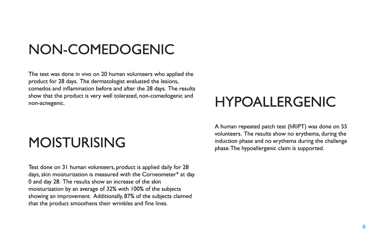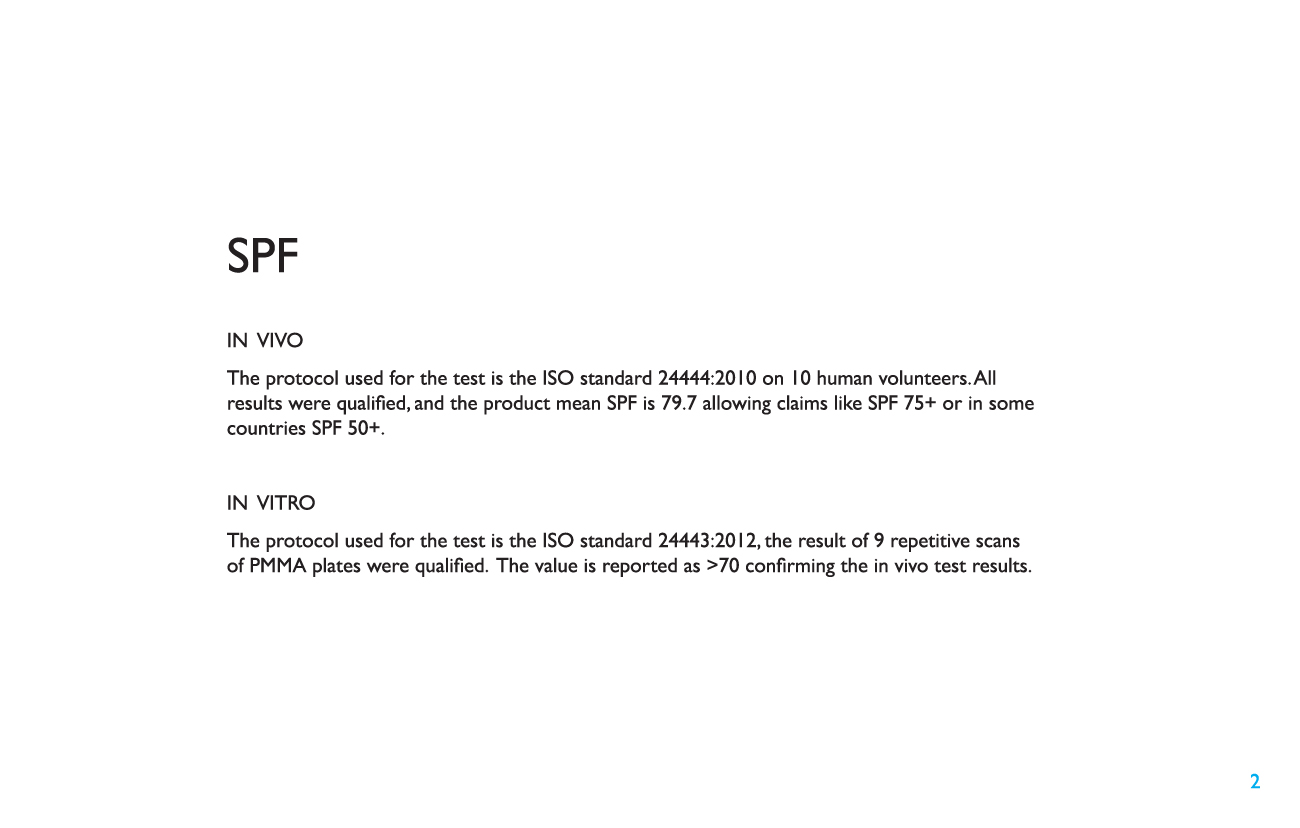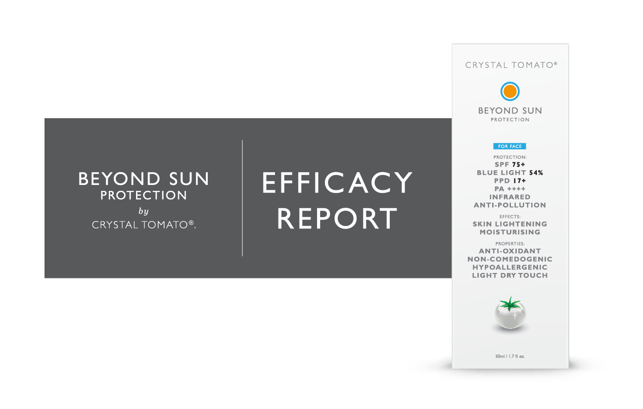 Crystal Tomato ®Beyond Sun Protection 水晶番茄防晒霜进行过以下测试:体外和体内 SPF 测试,防护等级为 79.7;体外和体内蓝光或高能可见光测试,防护等级为 54.1%;体内持续性色素黑化 (PPD) 测试,防护等级为 17.2 (PA++++);同时还具有防污染、红外线防护、抗氧化、不堵塞毛孔、不引起粉刺、低过敏性及美白功效。我们还对产品的补水功效进行了测试,结果显示使用 27 天后补水效果提升 32%。所有产品功效都有完整的科学证据支持。