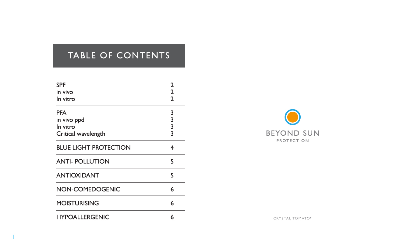 Crystal Tomato ®Beyond Sun Protection 水晶番茄防晒霜的所有防护等级都是根据临床试验结果确定并得到了临床验证。除了能够广泛防止有害太阳辐射造成伤害以外,Crystal Tomato ®Beyond Sun Protection 水晶番茄防晒霜还具有防污染、抗氧化和红外线防护功效,打造水润亮白肌肤的同时不会造成毛孔堵塞。上述每项功效都完全得到了权威机构的严格实验室测试或临床试验报告支持。